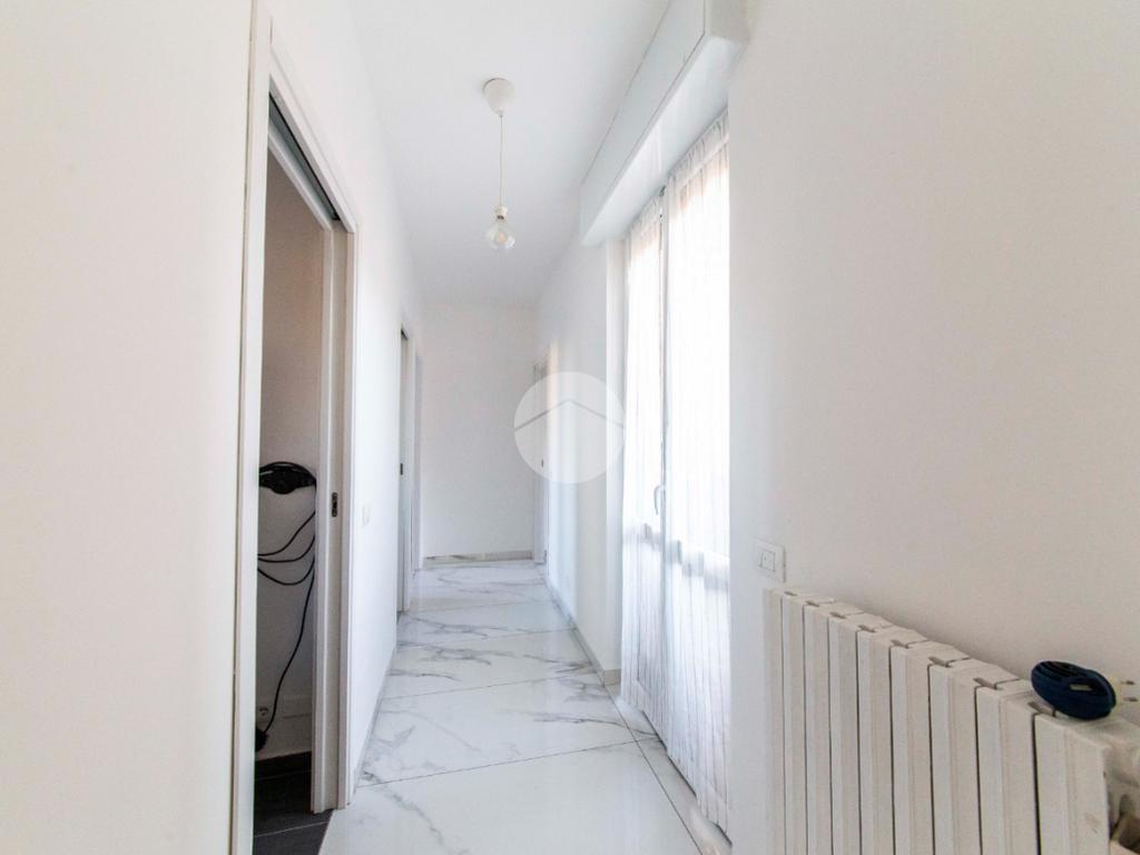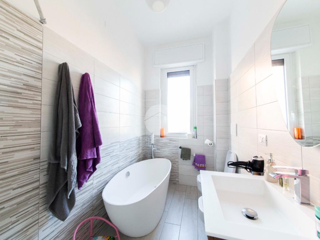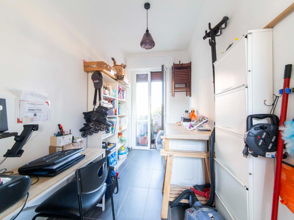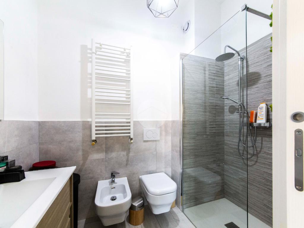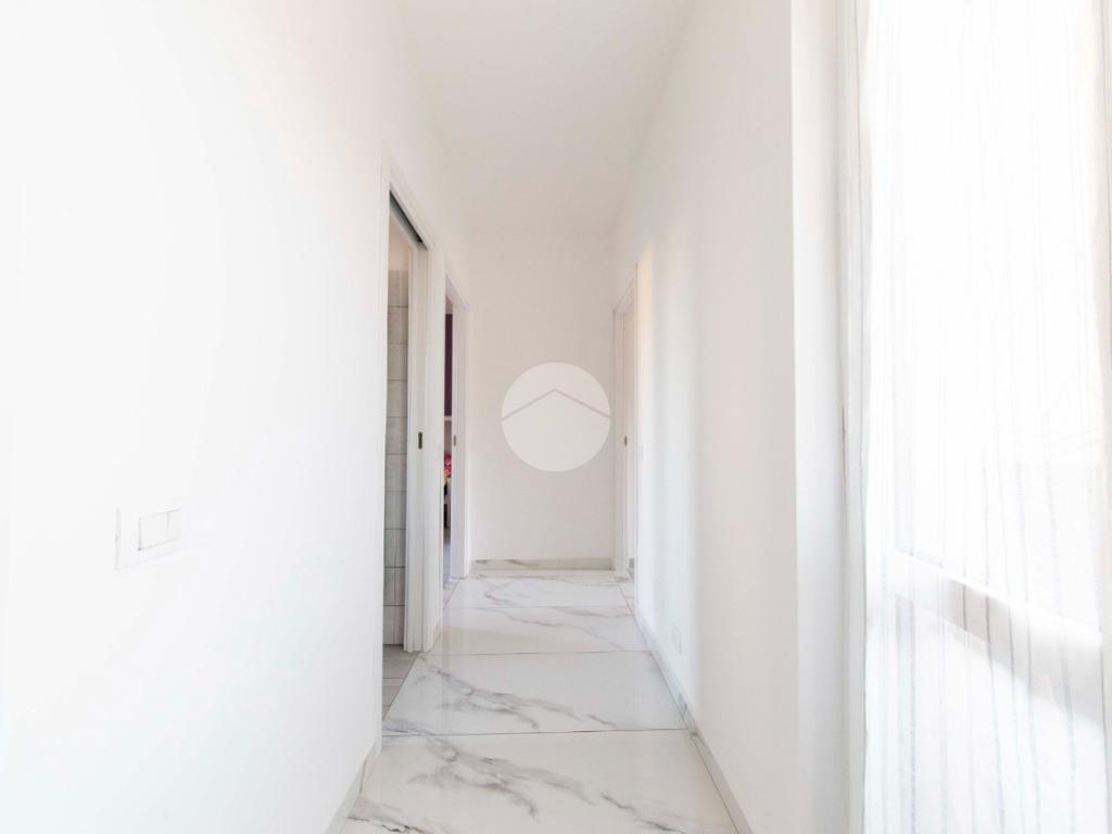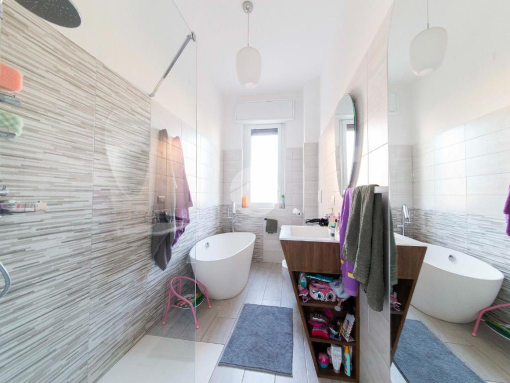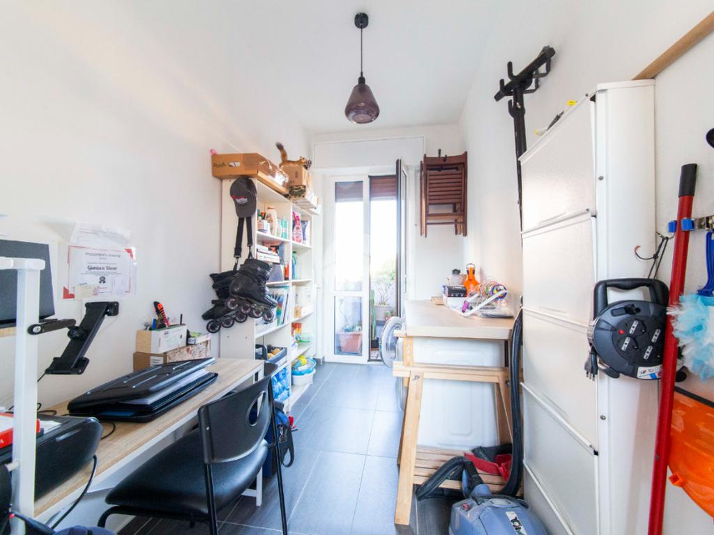Proseguendo lungo il disimpegno, sul lato opposto, si accede a una seconda camera da letto con porta finestra che conduce al balcone alla romana, anch’esso con affaccio sulla via principale. A seguire, una terza stanza attualmente adibita a lavanderia, ideale anche come cameretta, studio o stanza per gli ospiti. Completa la zona notte un ampio bagno padronale, finestrato, dotato sia di vasca che di box doccia,