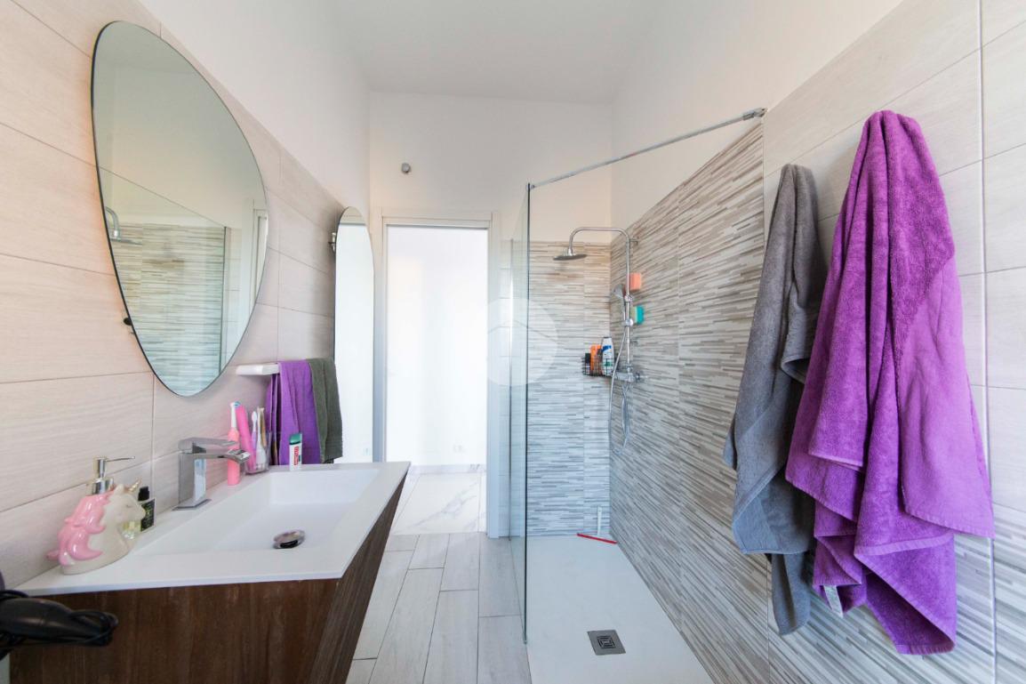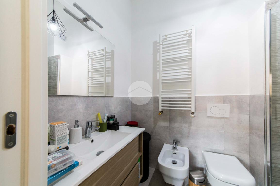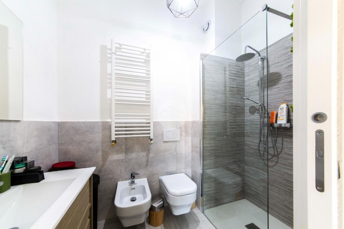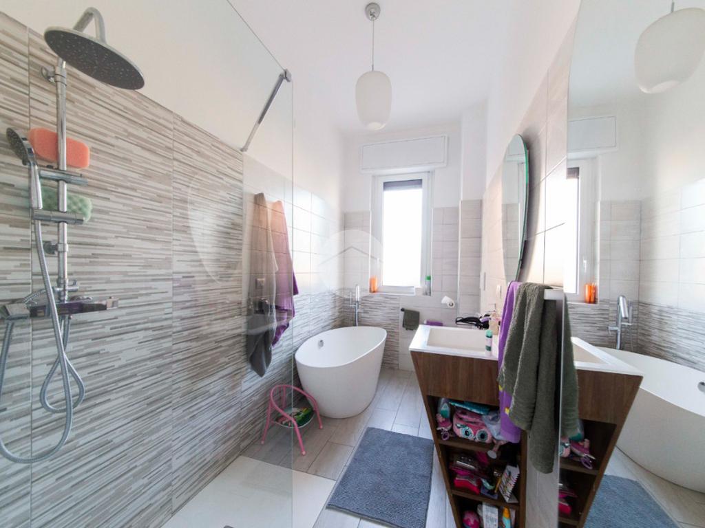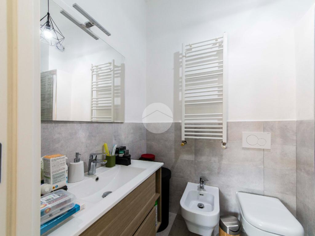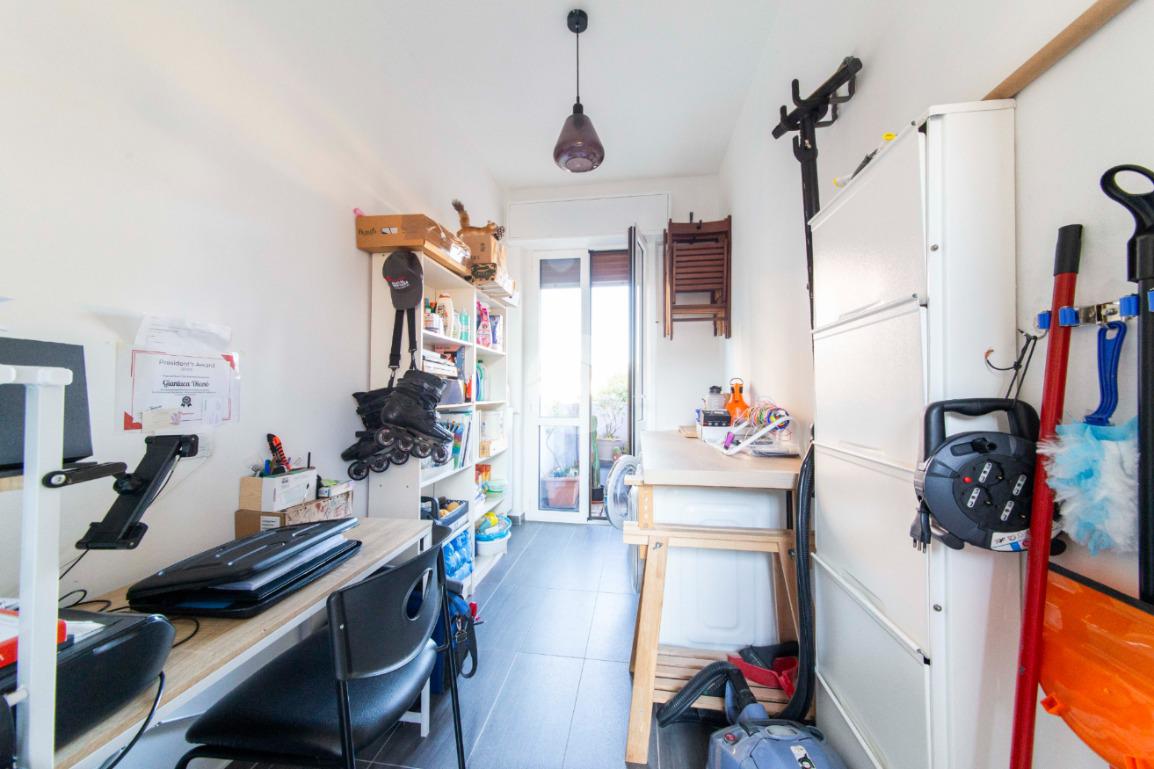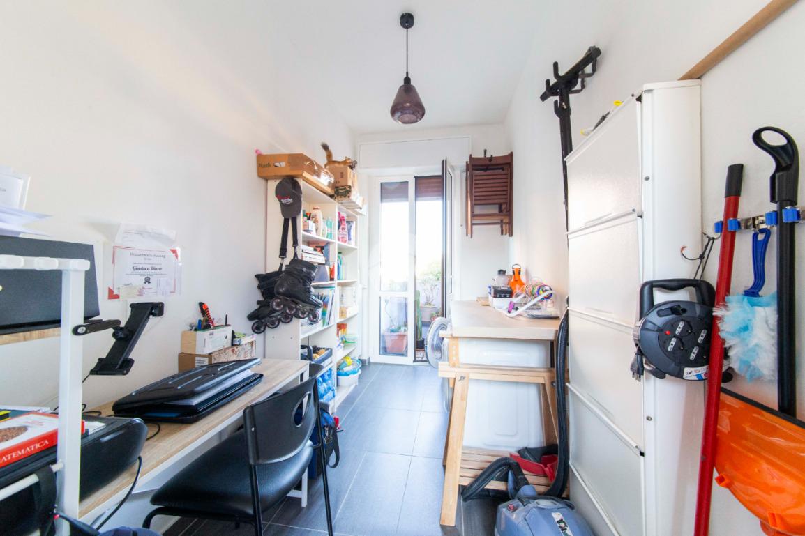 Proseguendo lungo il disimpegno, sul lato opposto, si accede a una seconda camera da letto con porta finestra che conduce al balcone alla romana, anch’esso con affaccio sulla via principale. A seguire, una terza stanza attualmente adibita a lavanderia, ideale anche come cameretta, studio o stanza per gli ospiti. Completa la zona notte un ampio bagno padronale, finestrato, dotato sia di vasca che di box doccia,