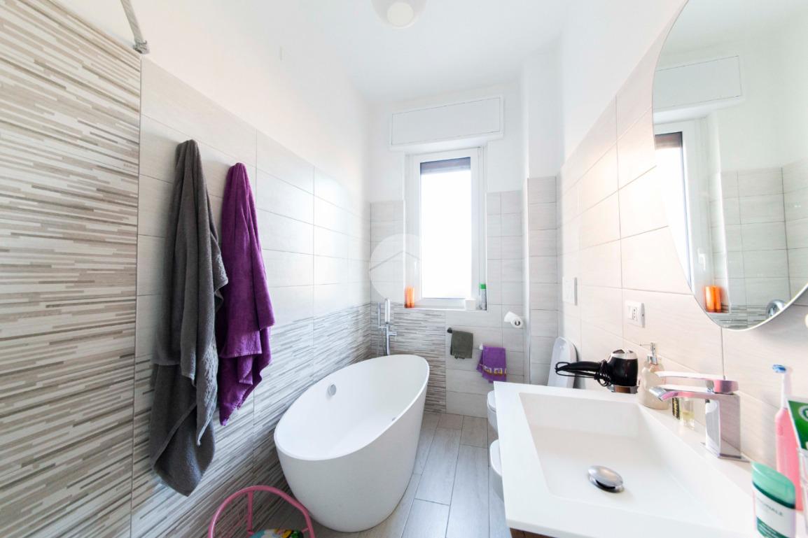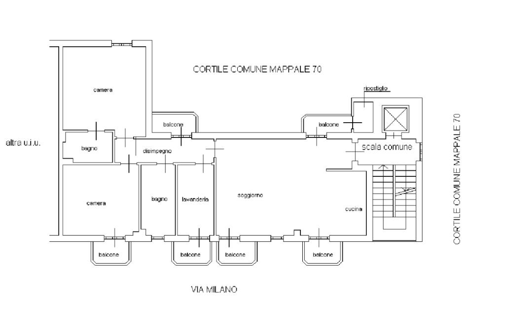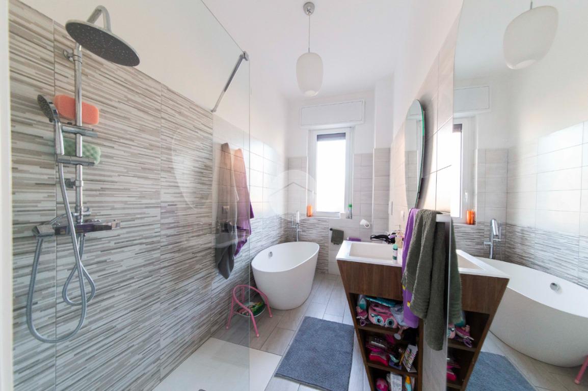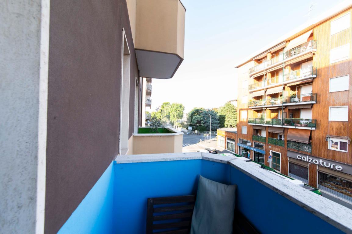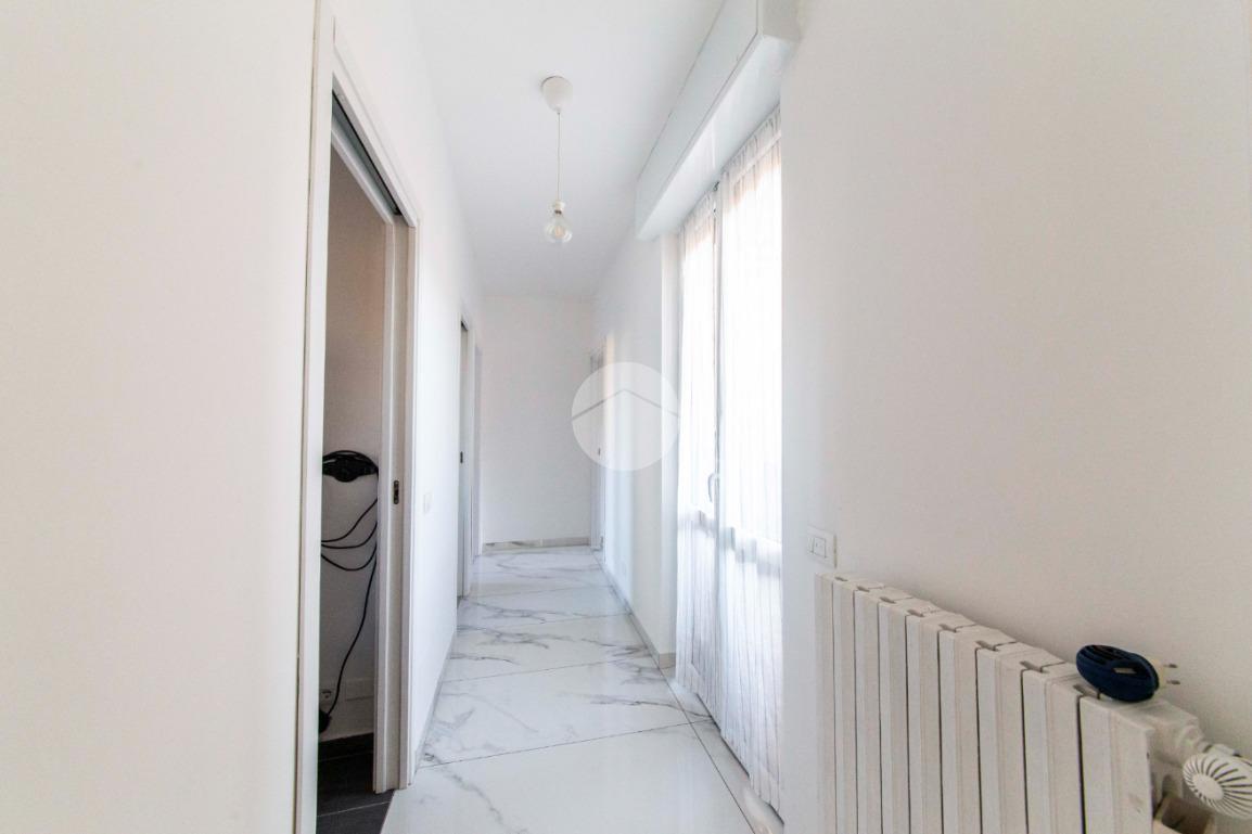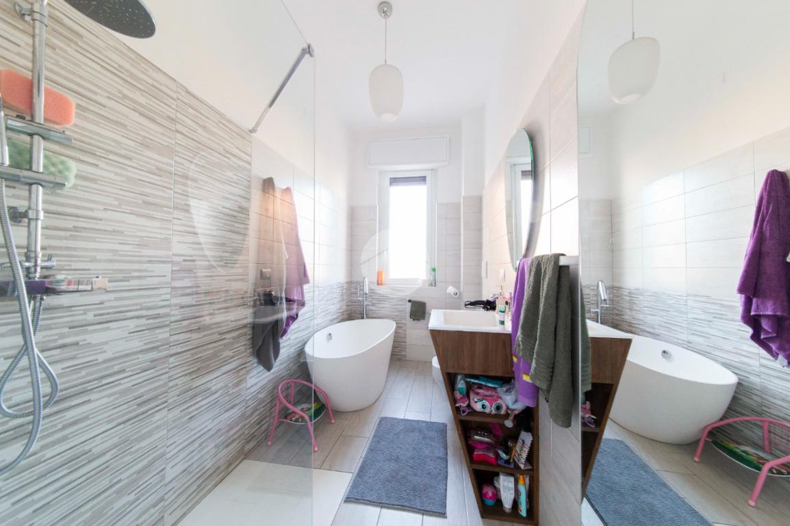 Proseguendo lungo il disimpegno, sul lato opposto, si accede a una seconda camera da letto con porta finestra che conduce al balcone alla romana, anch’esso con affaccio sulla via principale. A seguire, una terza stanza attualmente adibita a lavanderia, ideale anche come cameretta, studio o stanza per gli ospiti. Completa la zona notte un ampio bagno padronale, finestrato, dotato sia di vasca che di box doccia,